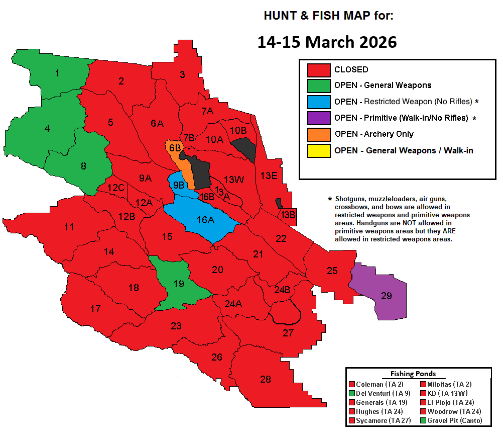 Forecast maps provide the best available information at the time of posting. All fishing reservoirs and hunt areas are subject to change without prior notice.